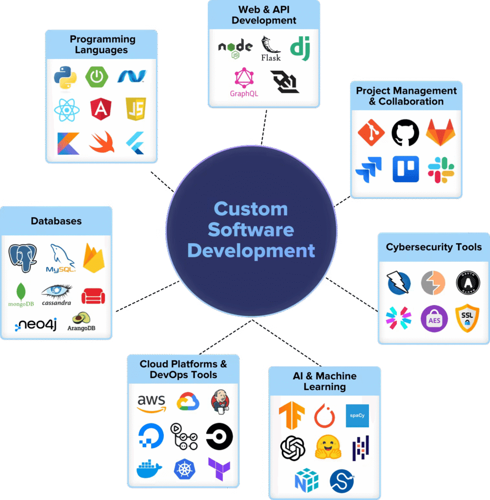 Choosing the right technologies is critical for building scalable, reliable, and future-ready applications. We tailor the technology stack to each client’s needs. A typical custom software development application incorporates: